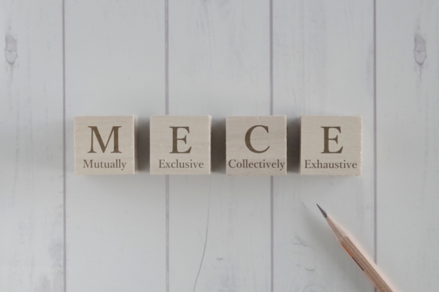 MECEの概念や意味について解説しました。例でも紹介したように漏れなく、ダブりが無いようにするのが大きなポイントです。問題を細かく切り分けて、計画を立てたり問題を解決したりしましょう。